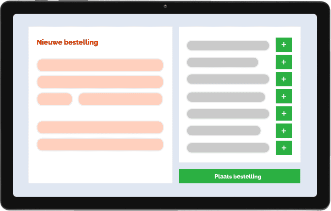 Deze bestellingen kunnen simpel en snel via een tablet ingevoerd worden. Naast een duidelijke lay-out waar alleen de nodige gegevens ingevuld moeten worden zoals naam, telefoonnummer en e-mail, kan met enkele klikken en een snelle filterfunctie de bestelling worden samengesteld.