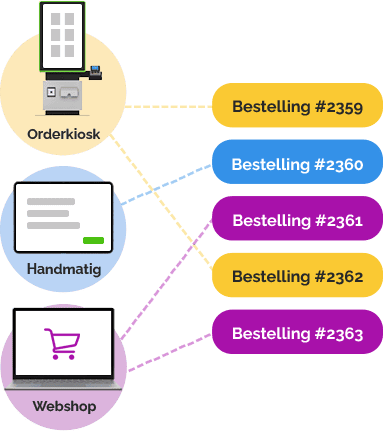 Door bestellingen samen te voegen in één centraal systeem, wordt alles overzichtelijk bij elkaar getoond in een duidelijke weergave. Deze weergave kan ingeladen worden op een laptop, tablet of een professioneel touchscreen.